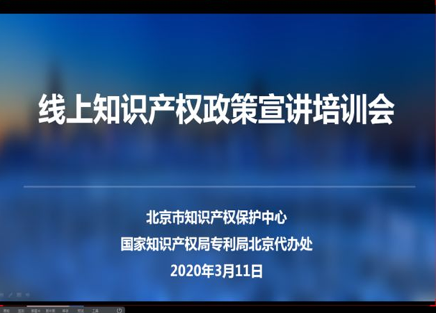 为方便创新主体快速有效地申请专利,3月11日-13日,北京市知识产权局第六支部(保护中心和国家知识产权局专利局北京代办处联合党支部)举办了三期线上送知识产权政策服务包活动。旨在深入落实新冠肺炎疫情防控要求,深化优先审查、专利申请、资助、预审、维权等服务,共同为抗疫防疫科技创新打造通衢大道,助力企业复工复产。270余名企事业单位和知识产权服务机构代表参加。