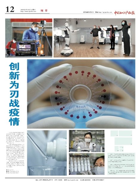 为精准助力企业战“疫”,北京市知识产权局第七党支部(促进局所在支部)积极收集参加抗疫的中关村企业名单、开展初步专利检索与分析工作、分类汇总了一批包含人工智能、测温、防护、消毒等多领域的高新企业名录,协调中国知识产权报记者对整理出的部分重点企业(达闼科技、北京旷视科技有限公司、博奥生物集团有限公司、北京幸福益生高新技术有限公司)进行多维度的采访,分别在中国知识产权报、人民日报图片库、中国日报亚洲新闻图片网进行了系列报道,并在3月13日中国知识产权报12版视觉版以“创新为刃战疫情”为主题整版报道了以4家企业为代表的中关村创新主体科技硬核产品对疫情防控的贡献,推动中关村企业提升专利培育与运用能力,增强企业核心竞争力,助力中关村建设成为具有全球影响力的科技创新中心。