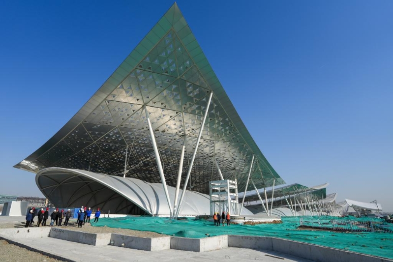 2月26日拍摄的北京城市副中心站综合交通枢纽工程和“京帆”屋盖。新华社记者 鞠焕宗 摄