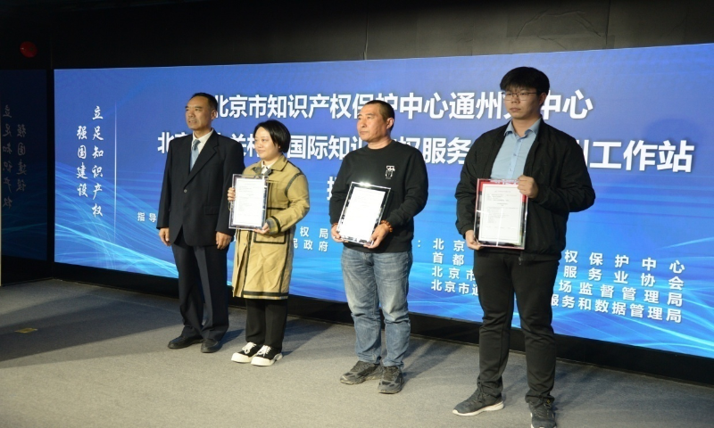 蔡鑫为通州区3家在北京市知识产权保护中心预审备案的企业发放《专利申请预审请求接受通知书》。