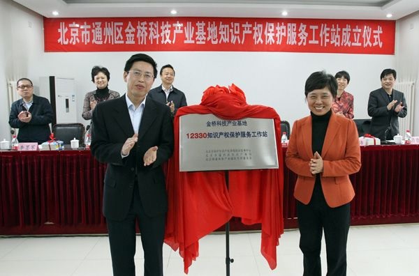 成立仪式上,北京12330与通州区知识产权局、北京国家环保产业园区管委会签署了12330知识产权保护服务工作站共建协议,北京市知识产权局副局长朱建红、通州区人民政府副区长陈少敏共同为通州区金桥科技产业基地12330知识产权保护服务工作站揭牌。